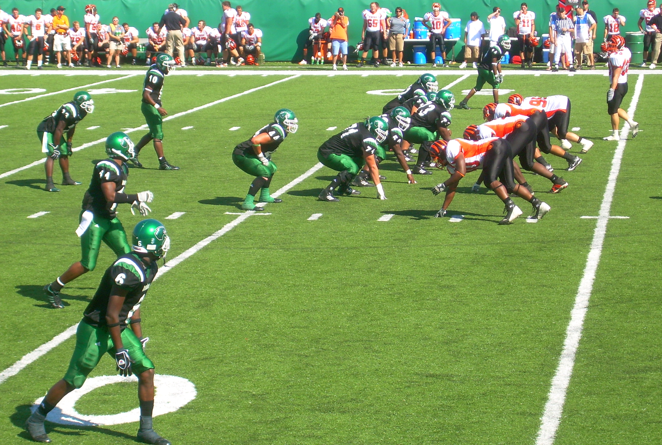 The photograph of a scene from a game of American football provides several excellent examples of different non-scalar depth cues. Specifically, the photo in Figure 1 shows the players of two teams awaiting the start of a play (or "down"). Notice that the players clearly appear spread across the field, some seeming much farther than others.