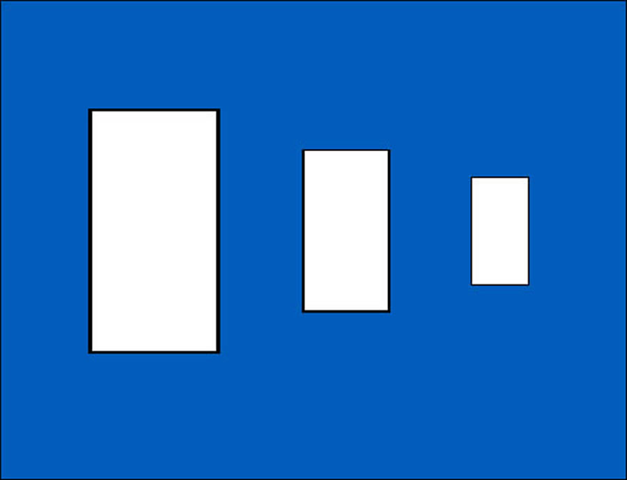 The relative size cue is illustrated in Figure 1 – a group of three, similar rectangles. If one did not have other types of information available (like the equality of focus/vergence, and a lack of both binocular disparity and motion parallax), the rectangle on the left would look closer than the one in the middle, which would look closer than the one on the right. Note that the similarity of shape is important. It is not just a change in angular size that creates the apparent depth; if the objects can easily be seen as independent, they may simply look larger or smaller, rather than at different distances.