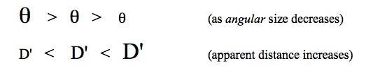 In each example, there are changes in angular size or separation. Thus, the value indicated by the Greek letter theta (θ) decreases from one part of the scene to another. The differences in angular size or separation produce the appearance of increasing distance (D'). Or, to provide a handy visual reminder, one might state: