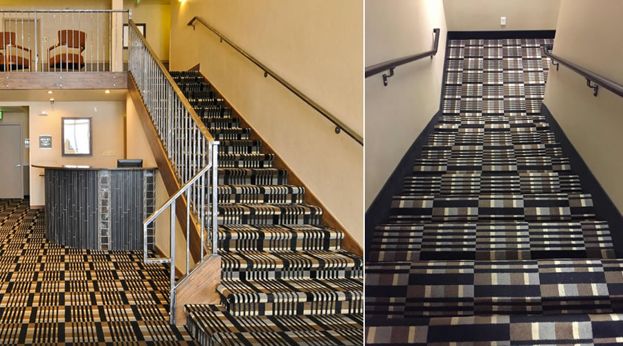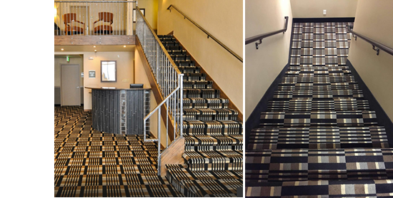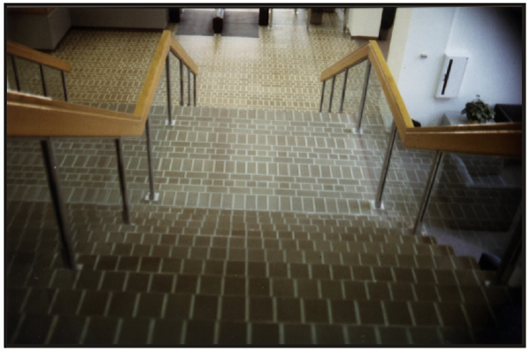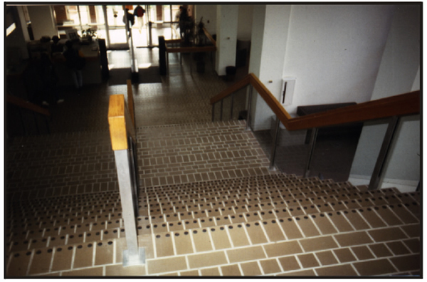The original design of the new stairway included a surface of beige-colored tiles, oriented with their longer dimension perpendicular to the edge of the stairs' tread. If one approached the stairs from the upper-floor lobby, it was possible to be confronted with the situation shown in Figure 1. To varying degrees, the tile pattern made it difficult to distinguish the edges of the treads. In particular, the grout that separated the tiles could be readily perceived as continuous lines and there was little to emphasize the individual steps that one had to navigate, in order to safely descend the stairs. Even the intermediate landing and the floor below were constructed of the same tile, creating further confusion.