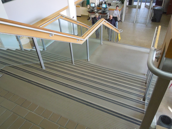 Although the overall facility is truly spectacular, including a robotic book mover that replaced most of the traditional stacks, two perceptual issues were immediately evident. And, once again, stairways were one of these concerns. (The other is more functional than safety-based. Several reading rooms feature large windows, lots of metal and other reflective surfaces. The resulting glare will likely result in decreased usage of affected areas during some periods of many days. During my own tour, for example, I noticed that the only patrons in one large room were all tucked into small clusters of chairs that were protected by shadows; areas in direct sunlight and glare were notably empty.)