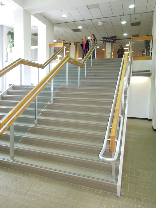 Eventually, the entire stairway area was walled off. Library visitors were all directed to the elevators. The old (new?) stairs were removed and a completely redesigned stairway was built. The process took 6-9 months, before access to the stairs was again permitted.