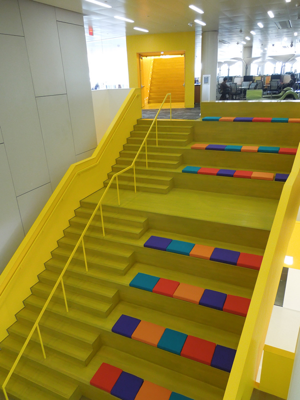 Since my visit, I have learned that at least some library staff members themselves call these new stairs the Stairs of Death. I will update this article, if the university decides to re-paint or redesign this aspect of the new facility. Meanwhile, I will hope my expectations are perhaps too pessimistic.
