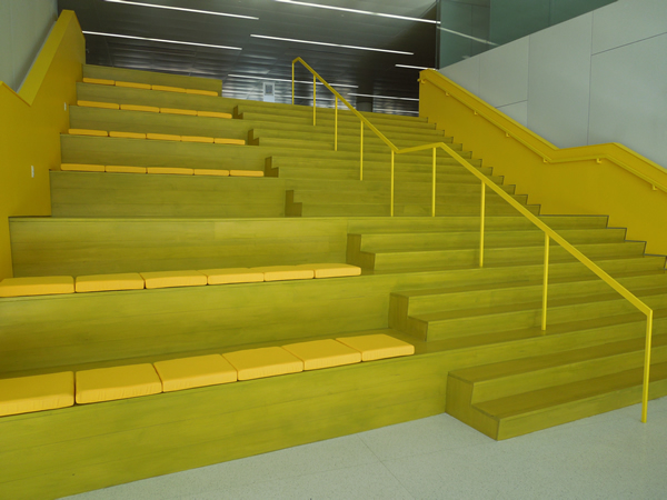 I will leave it to the reader to decide whether a study of perception and of human factors would support the architectural choices shown. Note in particular the similar, even if not identical, yellow on the stairs themselves, as well as the areas beside them. Note also the lack of any railing within grabbing distance, if you happen to misstep while descending. (Now add the consequences of a momentary distraction upon seeing a friend seated on a cushion beside the stairs. Consider how the possibility of a bad outcome might increase if one were descending the stairs of Figure 5 while carrying a load of study materials and/or a laptop.)