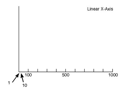 A Linear Plot provides coverage of the complete range of values, but may make it difficult to observe effects at the lower end of the range. Equal steps anywhere on a linear axis represent equal linear change; that is, a ten-unit difference involves the same separation, regardless of where the two values are located on the axis).