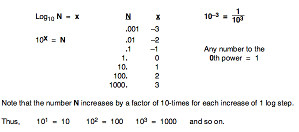 Put simply in words, a logarithm to the base 10, of any number N, is that exponent to which one must raise 10, in order to produce the original number. If we use x to represent the value of the logarithm, then the following relationships are true: