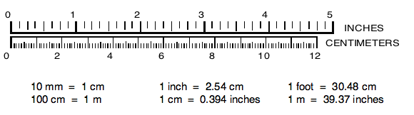 For scientific work, the use of the metric system of measurement is generally preferred to the English system. Units commonly seen in perception research are the millimeter (mm), the centimeter (cm), and the meter (m). A small comparison scale is shown below, along with some equivalents. (Note that although the relative lengths of these scales should be correct, their absolute lengths depend heavily on your particular video display.)