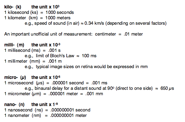 It is useful to know the basic prefixes that can indicate the overall scale of measurements. According to the International System of Measurement (aka the SI system), for any unit (e.g., a second, a meter), the following modifiers apply as shown: