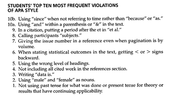 The following list from a textbook written by Dr. David Martin will illustrate just how easily one can stumble over the rules. He presents it as his "…..top-ten list of commonly made mistakes, á la David Letterman." (Hence, the count-down reverse order.) You will note that he has cleverly decided to extend his lesson by tucking an extra mistake into his list.